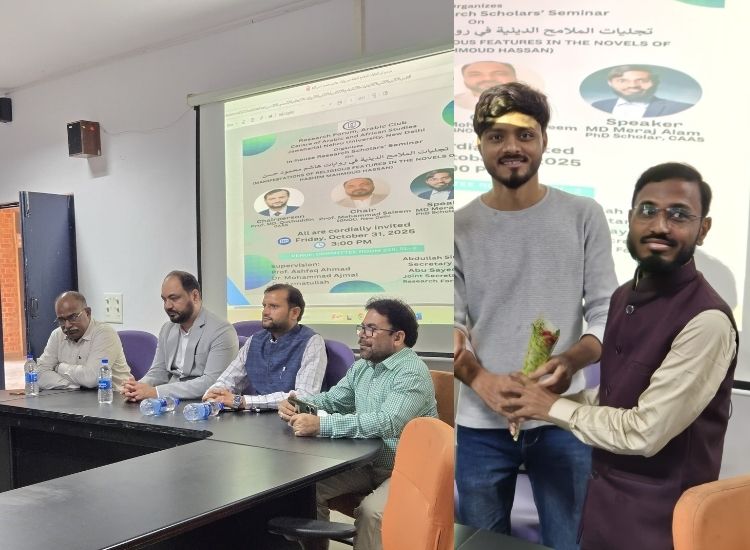 وتجدر الإشارة إلى أن الندوة الشهرية لباحثي المركز تُعقد بانتظام منذ عام 2015م، مع انطلاقة النادي العربي، وذلك خلال فترات رئاسة كلٍّ من الأستاذ مجيب الرحمن، والأستاذ بشير أحمد جمالي، والأستاذ رضوان الرحمن، الذين حرصوا جميعًا على ترسيخ هذا التقليد العلمي وتعزيزه. وقد شهدت الندوة توقفًا مؤقتًا إثر جائحة كورونا، شأنها شأن العديد من الفعاليات الأكاديمية عالميًا، غير أن الأنشطة المتنوعة للنادي العربي ظلّت متواصلة. ومع انطلاق العام الدراسي الجاري، أُعيد استئناف سلسلة الندوة الشهرية بروح جديدة، بما يعكس التزام المركز بدعم البحث العلمي، وخلق مساحة للحوار البنّاء وتبادل الخبرات بين الباحثين والطلبة، وتعزيز حضور اللغة العربية ومكانتها في الوسط الأكاديمي.