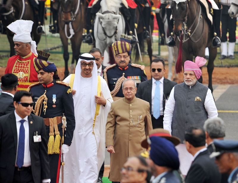 وأما في عام 2017م، فقد حلّ محمد بن زايد آل نهيان، ولي عهد أبوظبي آنذاك ورئيس دولة الإمارات العربية المتحدة الحالي، ضيفَ شرفٍ على الاحتفالات بيوم الجمهورية، خلال فترة رئاسة براناب موخارجي.