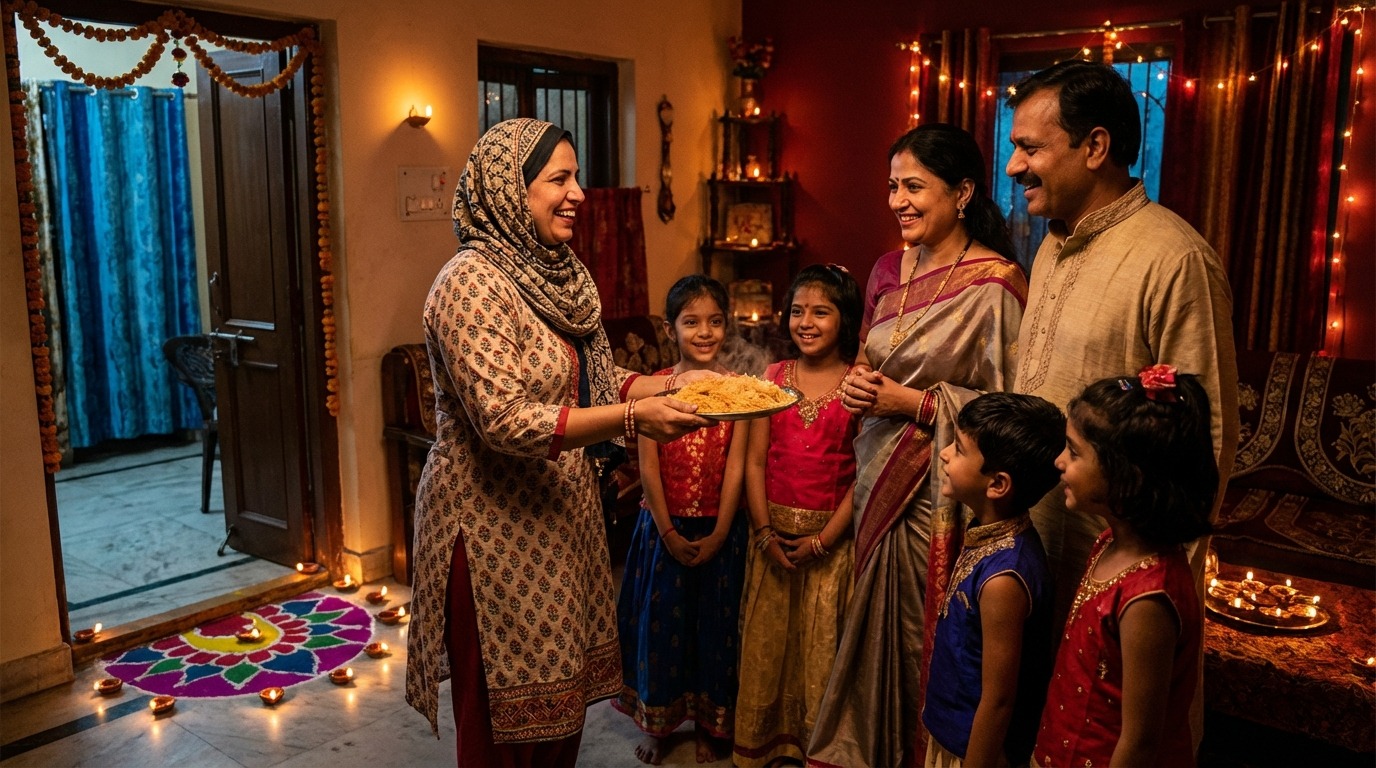 ومن أوّل ما أتذكّره من طفولتي ما يعطي مثالا حيا للتعايش بين المسلمين والهندوس، هو مساء ديوالي. كانت أمي تُشعل آخر مصباح ديوالي"دِيا"، حين طرق بابَنا أحدٌ. وكان الطَّرق مألوفًا. كانت عمتنا رُخسانة وقفت أمامنا تحمل طبقًا منالسِّيوَي الساخن، يعدّه المسلمون للاحتفال بعيد الفطر وعيد الأضحى. ويُعدّ الحلوى الأهم التي تُقدَّم للعائلة والأصدقاء في أجواء الفرح التي ترافق ختام شهر رمضان. وكان السِّيوَي ساخنًا حتى إنّ بخاره كان يضبّب نظّارته. وكانت ُخسانة تبتسم دائمًا وهي تقول: الضيافة لا تعرف دينًا، ثم تضع الطبق في يد أمي قبل أن نتمكّن من الاعتراض.