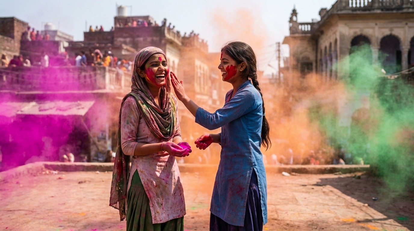 وكانت طفولتنا أبسط ما تكون، كما لو أن العالم كلّه كان أوسع وأكثر خفة. وفي الهولي، كنتُ أركض خلف صديقتي عائشة بينما يتطاير الغولال في الهواء كأنه قصاصات ملوّنة تهطل من السماء. كانت تضحك، تهرب، ثم تفتح خزانة أمها وتخرج منها قليلًا من آلتا — صباغٌ أحمر جميل تستخدمه الثقافة الهندية في المناسبات الميمونة—تمرّره على وجهي في لحظة خاطفة. ومن سطحٍ قريب، نادانا أحدهم: الآن تبدوان متشابهتَين تمامًا.
